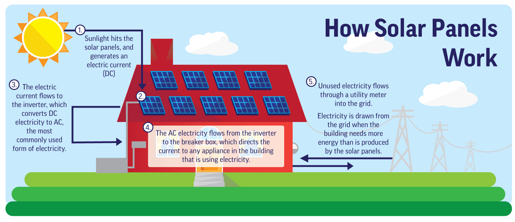 Solar cells generate direct current that run from the solar cells through invertor to run electric appliances